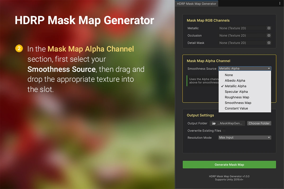 The HDRP Mask Map Generator was created to address this workflow pain point: creating Mask Map textures typically involves tedious manual processing of PBR texture channels — such as repeatedly extracting, merging, and exporting channels in image editing software. Additionally, freely available PBR textures online often only include roughness maps, which cannot be used directly with the HDRP Wizard to generate Mask Maps. This usually requires extra steps, like inverting them into smoothness maps or merging them into the alpha channel of metallic maps.