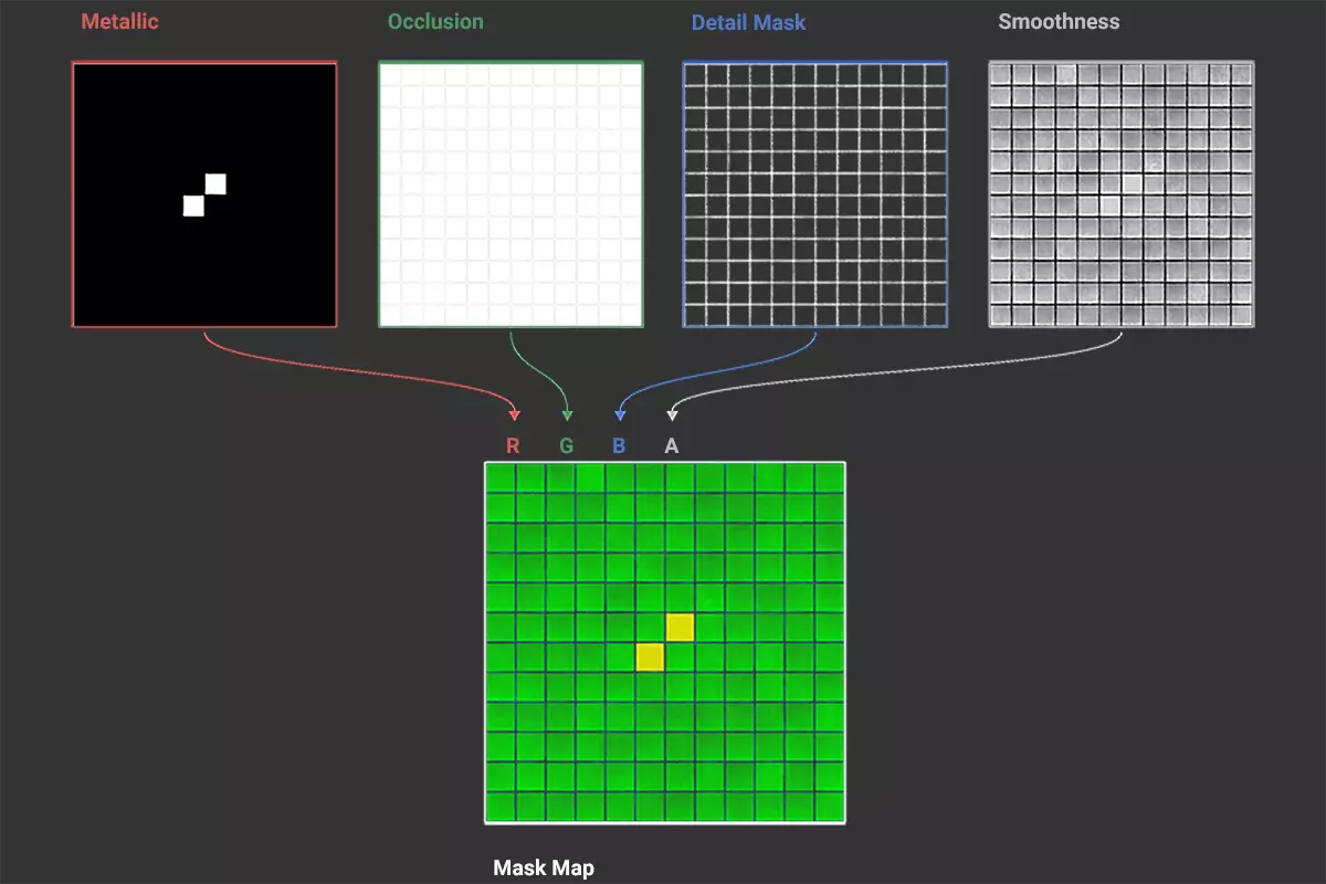 The HDRP Mask Map Generator tool extends the Unity editor and provides a visual interface to merge multiple independent PBR textures (such as Metallic, AO, Detail Mask, and Smoothness) into a Mask Map texture that complies with HDRP specifications, simplifying the material creation process. The merging process is shown in the following figure (PBR Textures: Tiles 132 A and Metal 048 C, sourced from ambientcg.com):